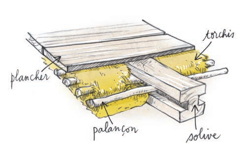 C’est la partie horizontale de la structure d’une maison à pans de bois ou d’une maison pierre. C’est un assemblage par simple superposition de pièces de bois. Le plancher est supporté par un ensemble de poutres en bois appelées solives* qui reposent sur les murs extérieurs et intérieurs. Les appuis des solives se font par un encastrement des abouts* dans un mur en maçonnerie, un retrait de la maçonnerie, sur une lambourde* ou sur des corbeaux*. Le plus souvent, une poutre intermédiaire est nécessaire lorsque la portée du plancher est supérieure à 4 m. Les planches sont directement clouées sur ces pièces de bois.