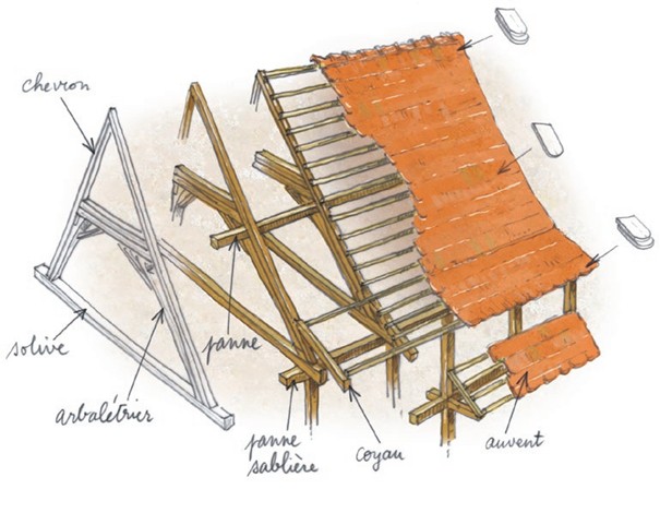 La charpente est composée d’une ossature principale, dont le rôle est de supporter la couverture et de résister aux intempéries, surtout au poids de la neige et aux poussées du vent. La structure secondaire s’appuie sur les pannes. Elle est constituée de chevrons, de coyaux, d’un lattage, d’un matériau de couverture.