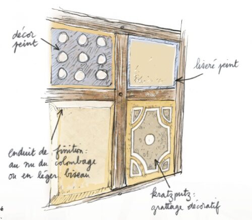 Les panneaux peuvent être décorés par un liseré de formes variées selon les régions et les époques. La mise en œuvre se fait directement avec l’enduit :