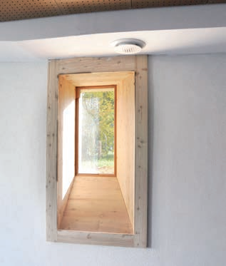 Les ouvertures sont ménagées au nu de la structure, par des cadres en bois. Les encadrements venant alors compléter la menuiserie et habiller l’ouverture peuvent être placés en tableau ou en applique. La fenêtre se situe en léger retrait vers l’intérieur.