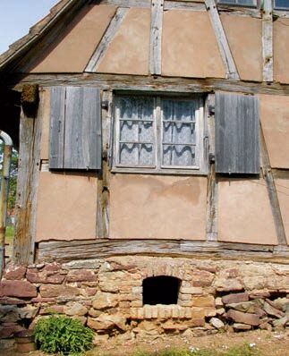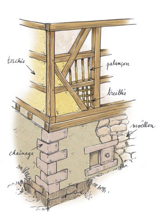 Elle est constituée d’une base solide et massive en pierre. Ces murs porteurs sont réalisés en moellons de grès ou de calcaire. Sur cette assise repose la panne sablière qui est la base de la structure à pans de bois. Ce système plus souple est mis en œuvre pour les façades, les murs de refends intérieurs et les planchers.