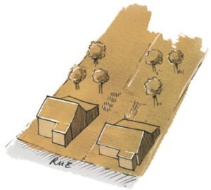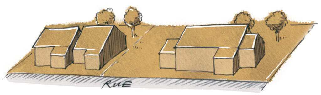 La disposition des différentes fonctions sur la parcelle résulte des exigences liées à l’exploitation agricole (cheminement, accès, des machines et des bestiaux). Il y a deux types de parcelles dominantes qui correspondent à deux principes d’implantation du bâti