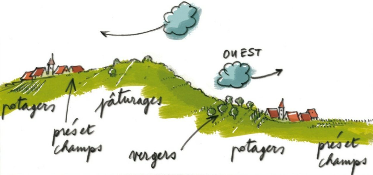 Ce passé rural se lit tant au niveau de l’architecture locale que dans les espaces ouverts (vastes prairies et terres cultivées). Il y a un lien fort entre l’implantation du bâti et son environnement naturel. La prise en compte de la topographie (adaptation à la pente, proximité de l’eau) et du climat (protection contre les intempéries et les vents dominants, expositions tenant compte de l’ensoleillement) en sont les facteurs déterminants.