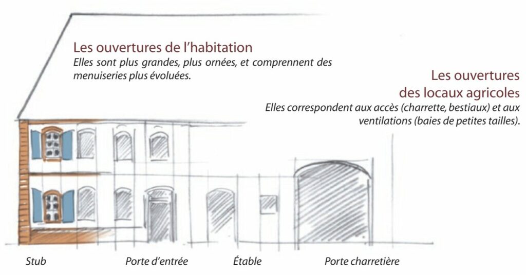 Les façades retranscrivent la logique d’organisation du plan de la maison. On distingue très clairement l’habitation et les locaux agricoles. Il y a très peu d’ouvertures dans les murs des granges. Ce sont l’usage et la fonction des espaces et les proportions de la façade qui dictent la taille et le nombre d’ouvertures de l’habitation.