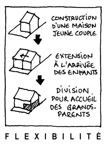 Cependant, chaque projet devrait développer un espace polyvalent non figé, permettant d’imaginer des usages multiples (vie familiale, accueil, activités saisonnières). L’habitation devrait pouvoir évoluer avec la famille, en fonction des besoins.