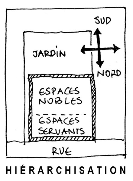 Il est impératif de hiérarchiser les espaces nobles des espaces servants. Il s’agit de bien réfléchir à la position des espaces de vie, des lieux de travail, des espaces plus techniques comme les circulations, la chaufferie, le cellier. L’enjeu est d’économiser les surfaces bâties et donc de réduire les coûts et de limiter le volume des espaces chauffés, tempérés.