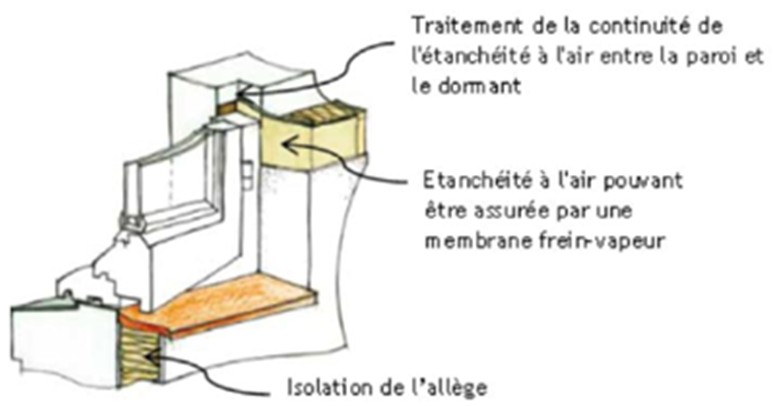 Il faut porter une attention particulière sur la maîtrise du détail de la jonction entre l’isolant et les menuiseries afin d’éviter des ponts thermiques. Il faut également veiller à la continuité du frein-vapeur qui devra se fixer au cadre des menuiseries.