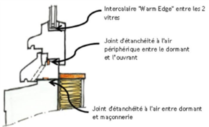 Le point de vigilance se situe au niveau de la liaison mur/cadre dormant. A cet endroit, il s’agit de limiter les défauts d’étanchéité à l’air qui pourraient résulter d’interstices ou de trous entre la menuiserie et les murs.