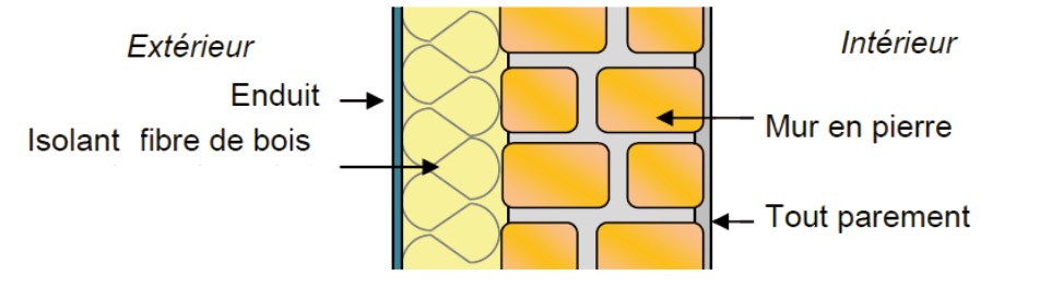 L’attention doit être portée sur le choix de la nature du matériau isolant. Afin de préserver une bonne capacité de séchage du mur en pierre, il est recommandé la mise en œuvre d’un isolant ouvert à la diffusion de vapeur d’eau de type fibreux, par exemple des panneaux de fibres de bois.