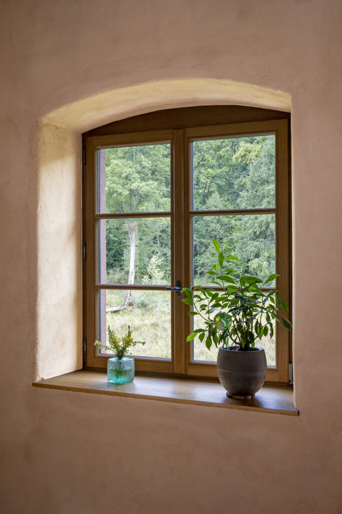Il est composé de sable et de chaux avec un ajout, par exemple, de liège, pour la correction thermique et de la poudre de Diatomées, pour la capillarité et la gestion de l’humidité. Cet enduit permet de conserver les qualités perspirantes de l’enveloppe tout en renforçant de 2,5 fois la résistance thermique des murs.
