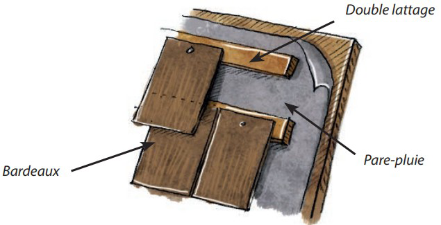 Les bardeaux* doivent avoir au moins 10 mm d’épaisseur. Ils sont cloués ou agrafés sur un support continu ou sur des liteaux croisés. Le recouvrement est supérieur à 15 % de la largeur, avec un minimum de 15 mm. Il faut 2 à 2,5 m2 de bardeaux pour couvrir 1 m2 de façade. Cette technique permet un perpétuel renouvellement d’une petite partie en fonction de la durabilité du bois. Cela évite de démonter l’ensemble de la façade.