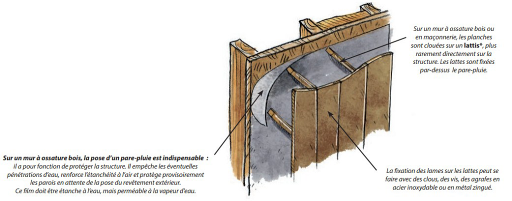 Afin d’assurer un bon comportement du revêtement dans le temps, une lame d’air est réalisée par des tasseaux fixés verticalement ou horizontalement. L’épaisseur de la lame d’air est généralement comprise entre 15 et 30 mm. Elle permet l’évacuation de la vapeur d’eau et de l’eau de ruissellement.