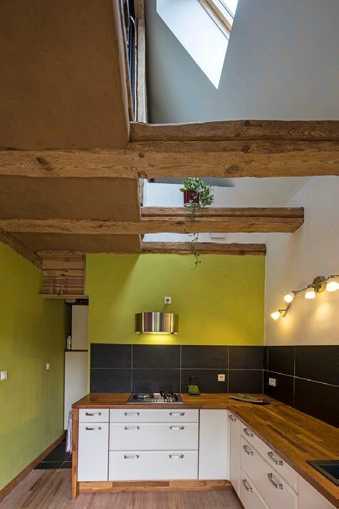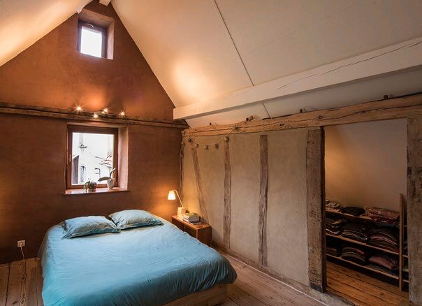 - Respect de l’équilibre hygrométrique des murs anciens : piquage des plâtres et enduits non perméables à la vapeur d’eau, retrait de plaques bitumineuse et mise en œuvre d’un enduit terre ou à la chaux.