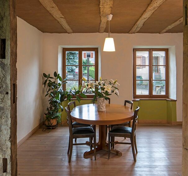 La réhabilitation de la maison a été récompensée par un second prix dans le cadre de l’appel à projet éco-rénovation du Parc naturel régional des Vosges du Nord et de la Fondation du patrimoine. Elle a également reçu un prix dans le cadre de l’appel à projet de la Région : « Je rénove BBC », grâce à l’excellente performance thermique atteinte. Les propriétaires profitent aujourd’hui pleinement du confort particulier de leur maison, dans des espaces largement ouverts, lumineux et atypiques. Les matériaux de finition (enduits terre, aux murs et aux plafonds, enduits à la chaux légèrement texturés, huile dure blanche sur les planchers) apportent une touche originale et chaleureuse dans des espaces ouverts résolument contemporains.