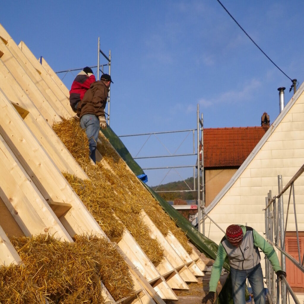- Isolation de la toiture en bottes de paille d’avoine de 30 cm d’épaisseur ; des murs en béton de chanvre banché et en laine de chanvre.